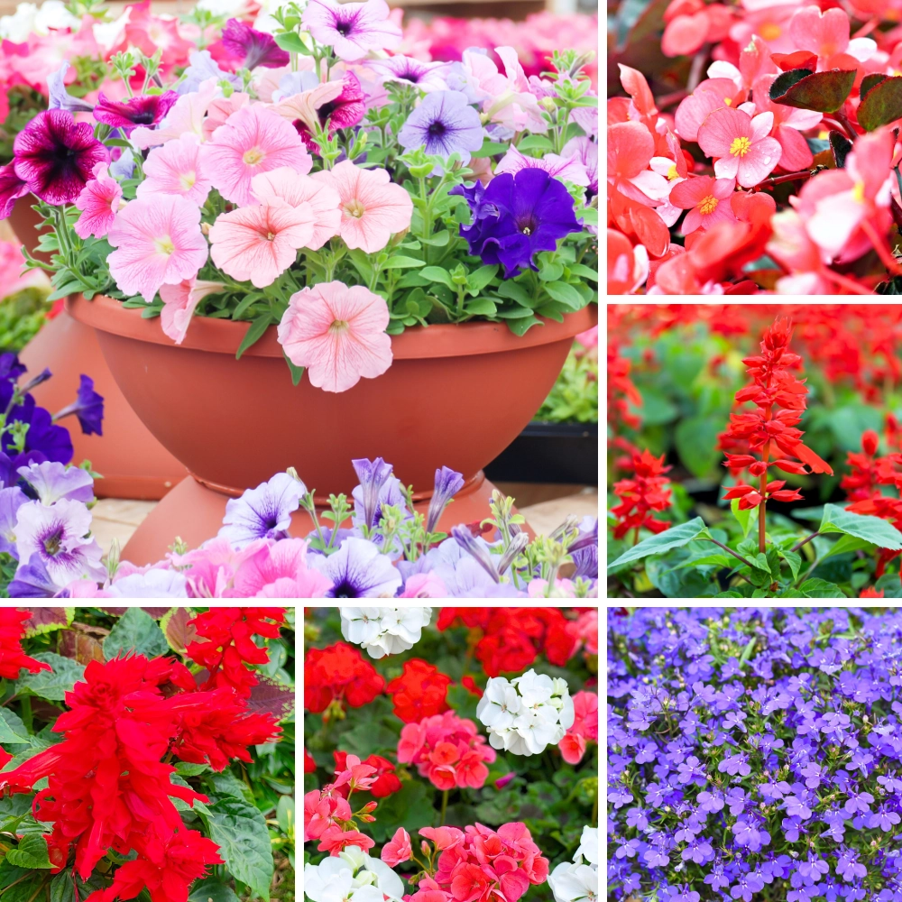 Kompletny zestaw roślin jednorocznych został opracowany z myślą o uzyskaniu długotrwałego efektu dekoracyjnego w różnych warunkach uprawy. W skład zestawu wchodzą gatunki o zróżnicowanym pokroju i intensywnych barwach, które wzajemnie się uzupełniają i tworzą harmonijną całość. Begonia stale kwitnąca i pelargonia rabatowa odpowiadają za stabilną strukturę kompozycji, natomiast lobelia, szałwia oraz petunia wprowadzają lekkość i wyraziste akcenty kolorystyczne.