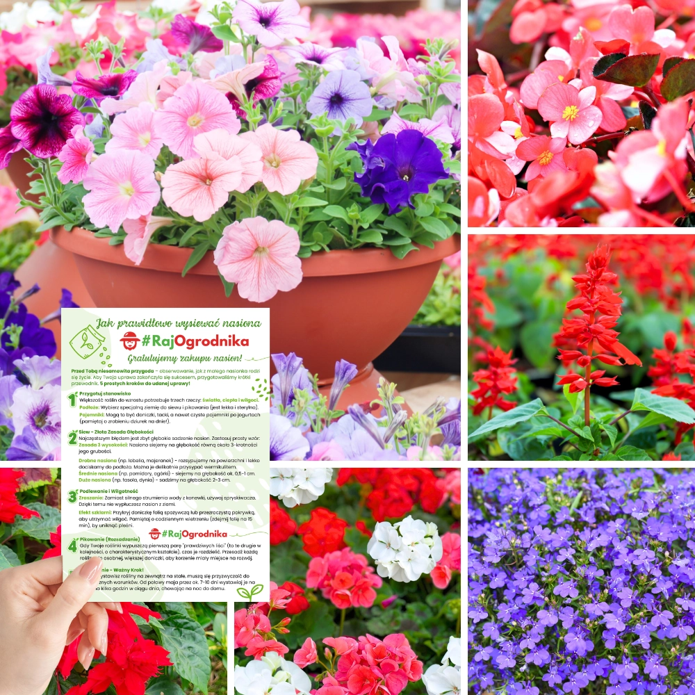 ✅ Różnorodność kolorów i form kwiatów. Zestaw łączy barwy czerwieni, różu, amarantów, błękitów oraz wielobarwne mieszanki. Pozwala to tworzyć atrakcyjne kompozycje bez potrzeby doboru dodatkowych gatunków.